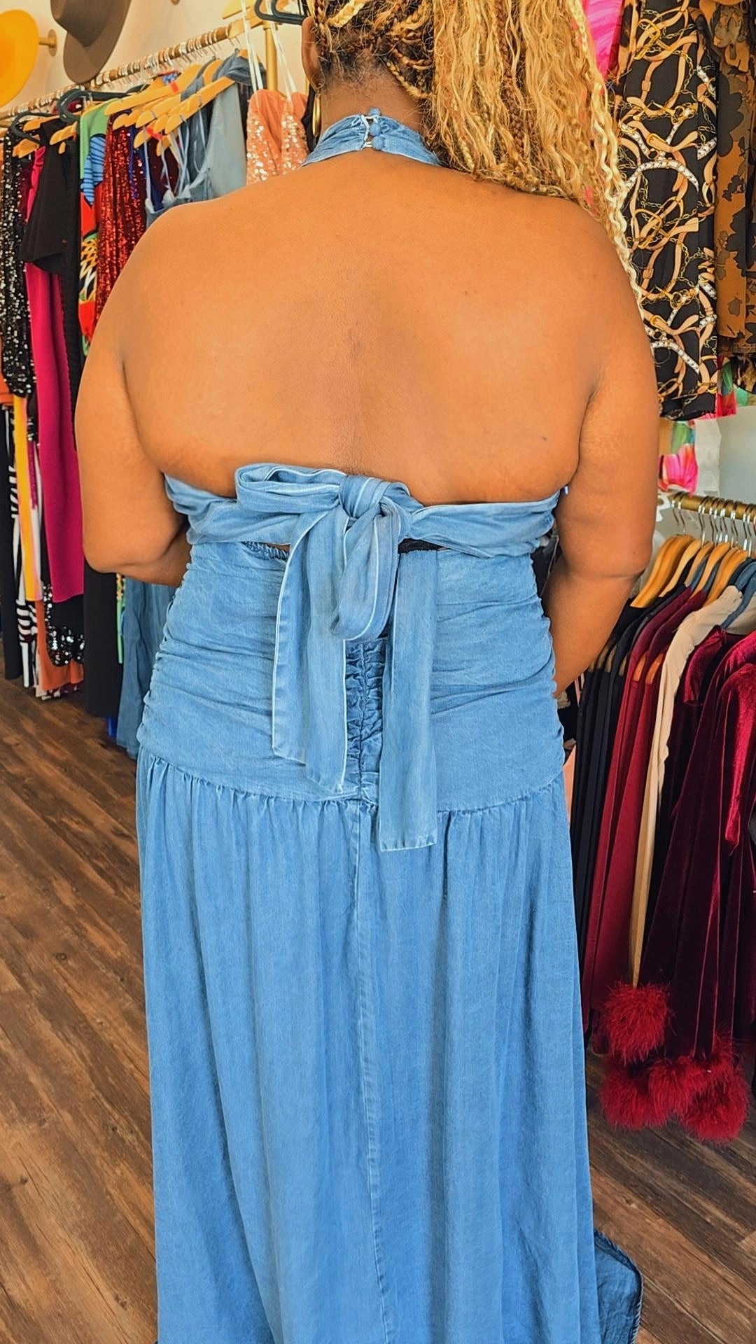 Turn heads in this denim halter dress. This chic denim halter dress is designed to make a statement. Featuring a deep V-neckline and flirty front side slit, it perfectly balances edgy and feminine. The halter-style top ties into a delicate bow at the back for a custom fit and added charm. Finished with a sleek back zipper, this dress hugs your curves in all the right places. Dress it up with heels, sandals or keep it cool with sneakers- either way, you're set to steal the spotlight.
